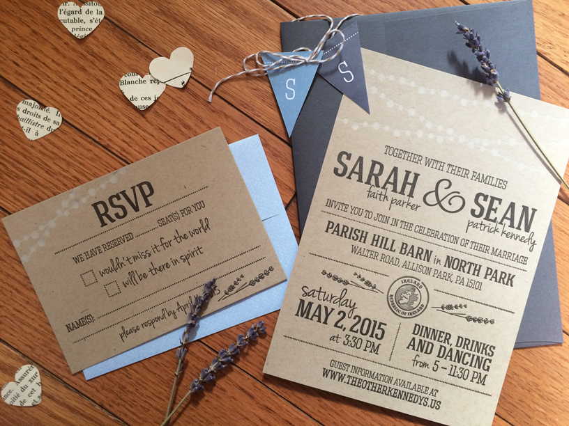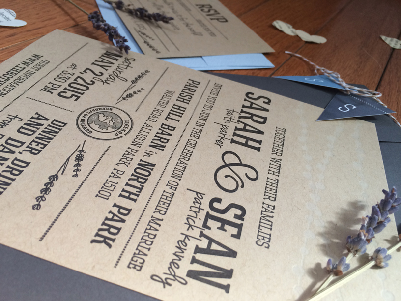 These were printed on kraft paper with two color letterpress (black and white). Our theme was rustic Irish and our colors were dark grey and dusty blue. The little paper confetti hearts (stamped from old French books.. ooh la la!) and dried lavender were actually a part of our wedding decor as well, I just happened to have some left over to decorate these photos with.